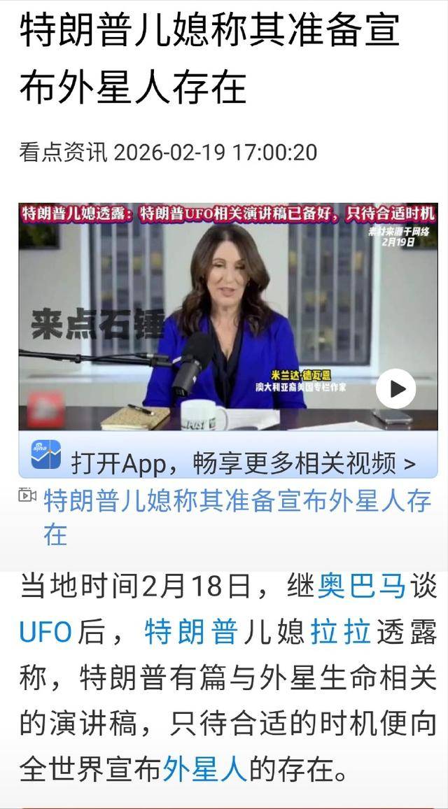 特朗普的儿媳拉腊前几天还上了个播客爆料:老爷子手里有份演讲稿,专门讲外星生命的,“时机到了就会拿出来”。小特朗普也跟着煽风点火,说“现在可以相当确定地说,有证据表明存在与我们的星球接触的非人类智能”。