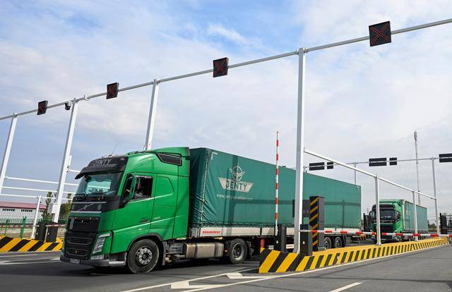 9月17日,来自俄罗斯的货车从位于新疆塔城地区的巴克图口岸海关集中查验场地出关。(王菲 摄)